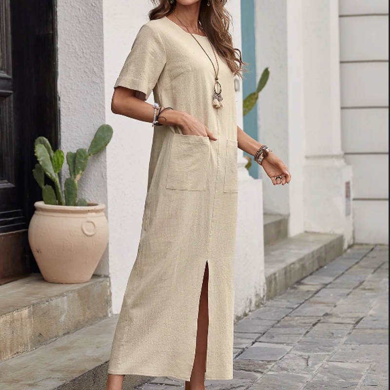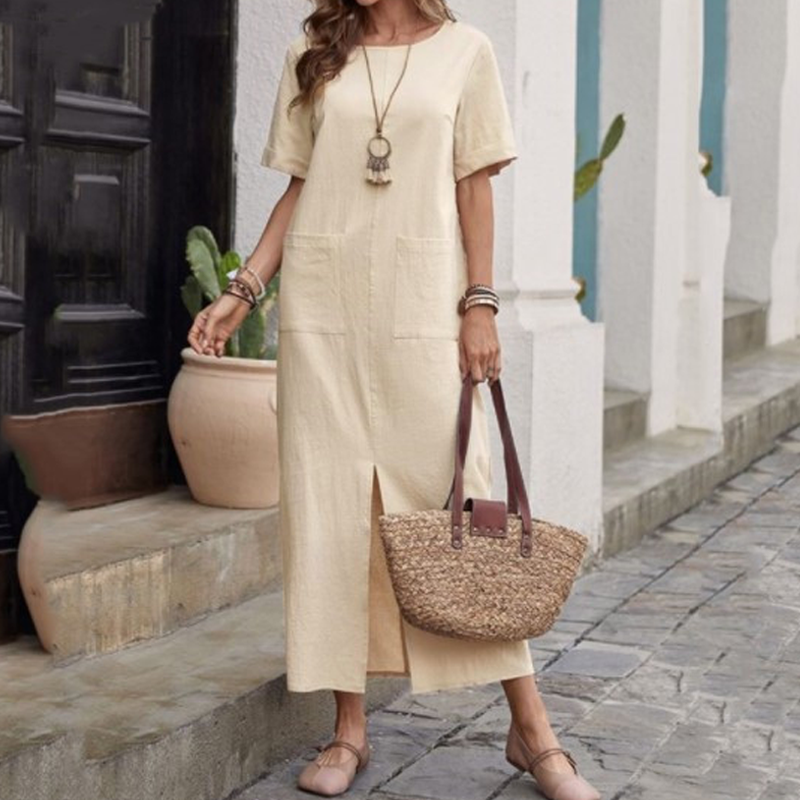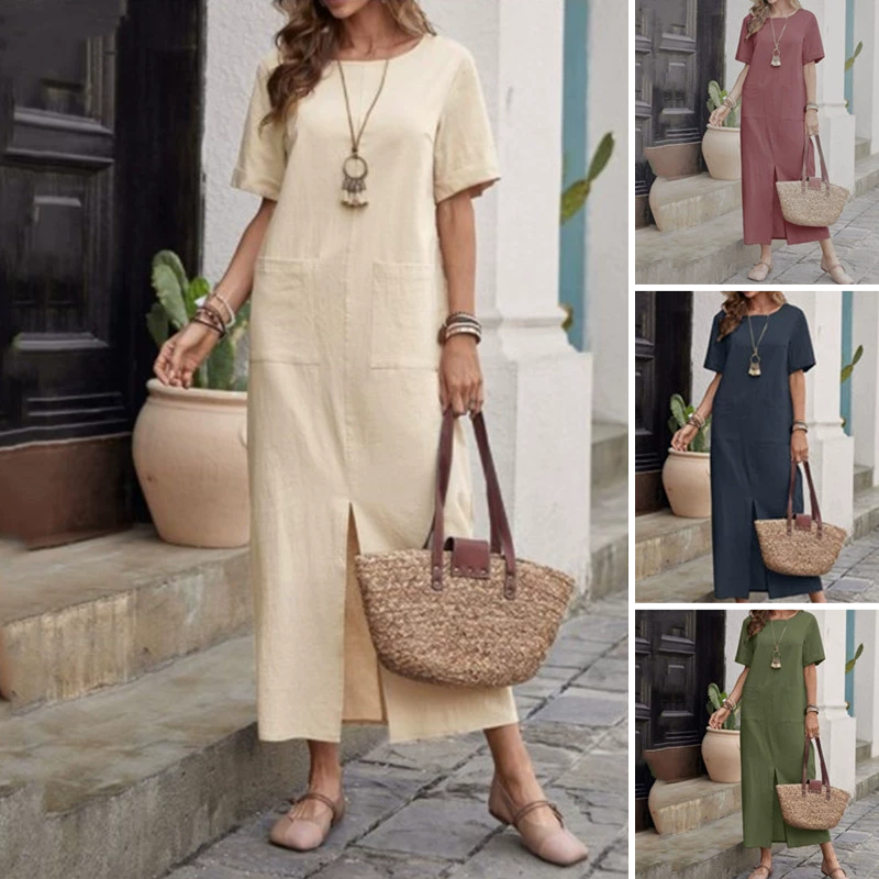 🔥Drugi element odzieży🔥🌈Bawełniano-lniana luźna sukienka z okrągłym dekoltem