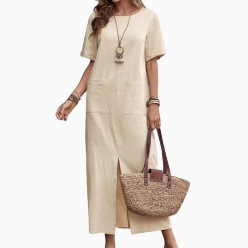 ODDYCHAJĄCY CHIC - Płyń przez cały dzień w tej przewiewnej bawełniano-lnianej maxi, łączącej swobodę z wyrafinowanym stylem. Luźna sylwetka z wdziękiem otula krągłości, a boczne rozcięcie dodaje odrobinę ruchu i szyku.