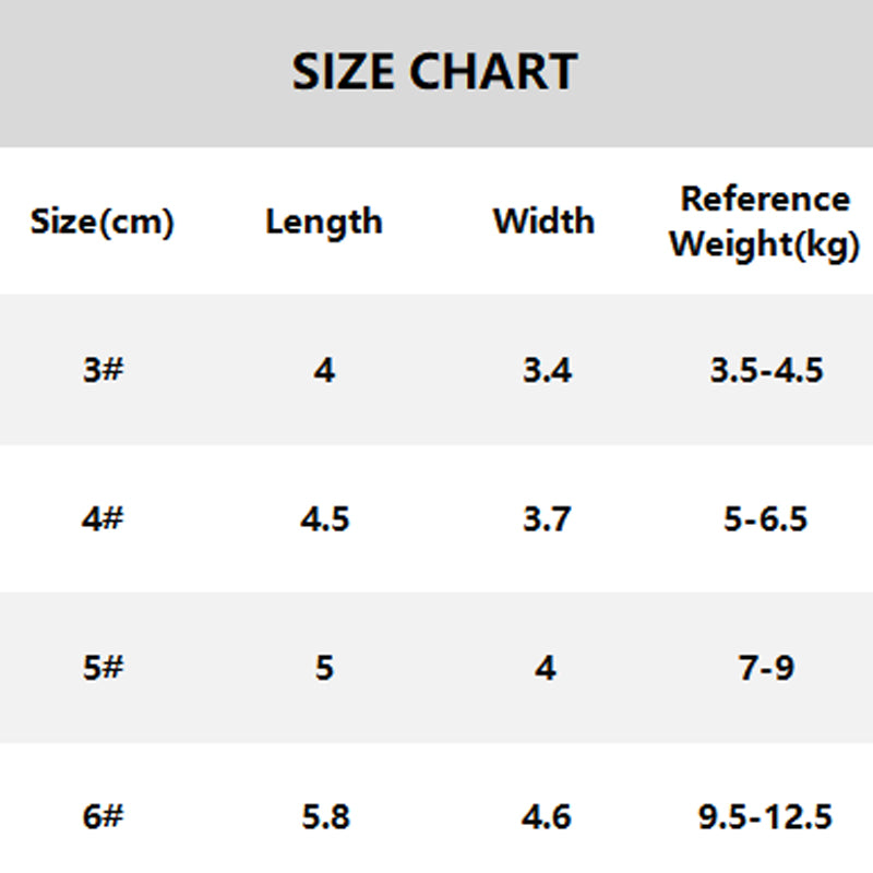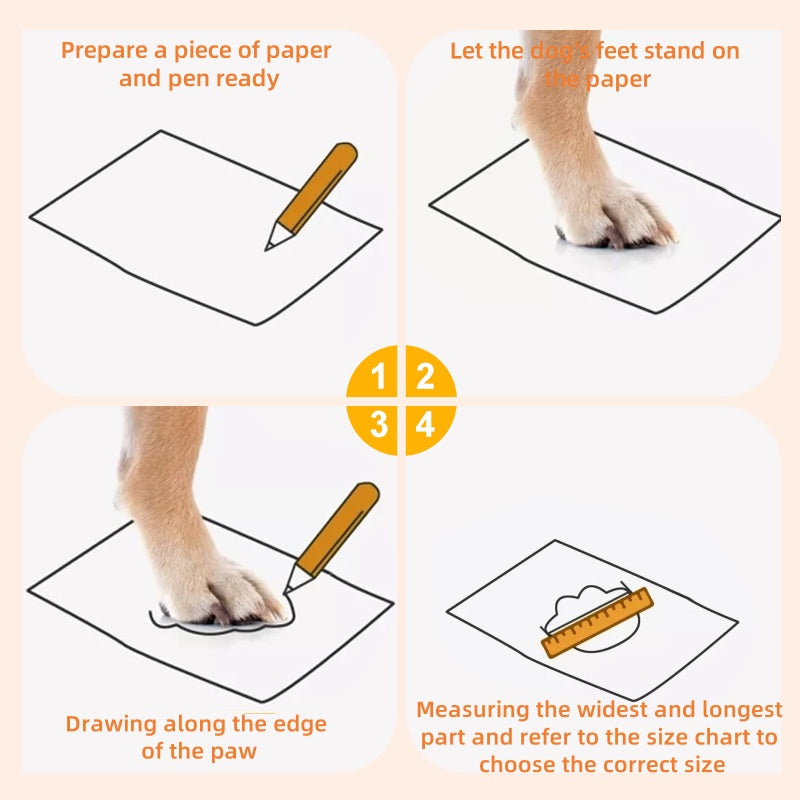 WYBÓR ROZMIARU: Aby dokonać prawidłowego pomiaru, poproś psa, aby stanął na kartce papieru, narysuj linie wokół łapy i zmierz najszerszą część. Dla wygody wybierz rozmiar nieco większy niż dokładny pomiar łapy.
