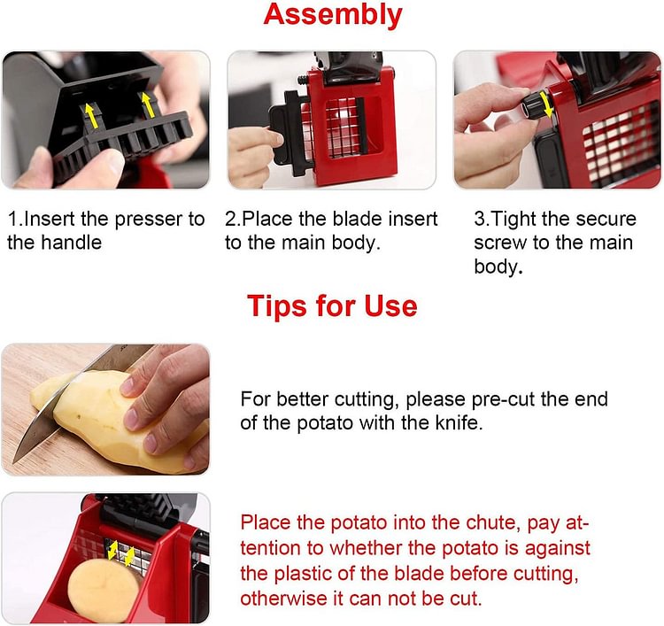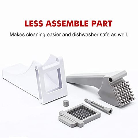 - Bezpieczna i łatwa w czyszczeniu - krajalnica do frytek wykonana jest z nietoksycznego i wolnego od BPA materiału ABS przeznaczonego do kontaktu z żywnością. Czyszczenie wymaga mniejszej liczby części, co pozwala wyczyścić krajalnicę do frytek pod bieżącą wodą w kilka sekund.