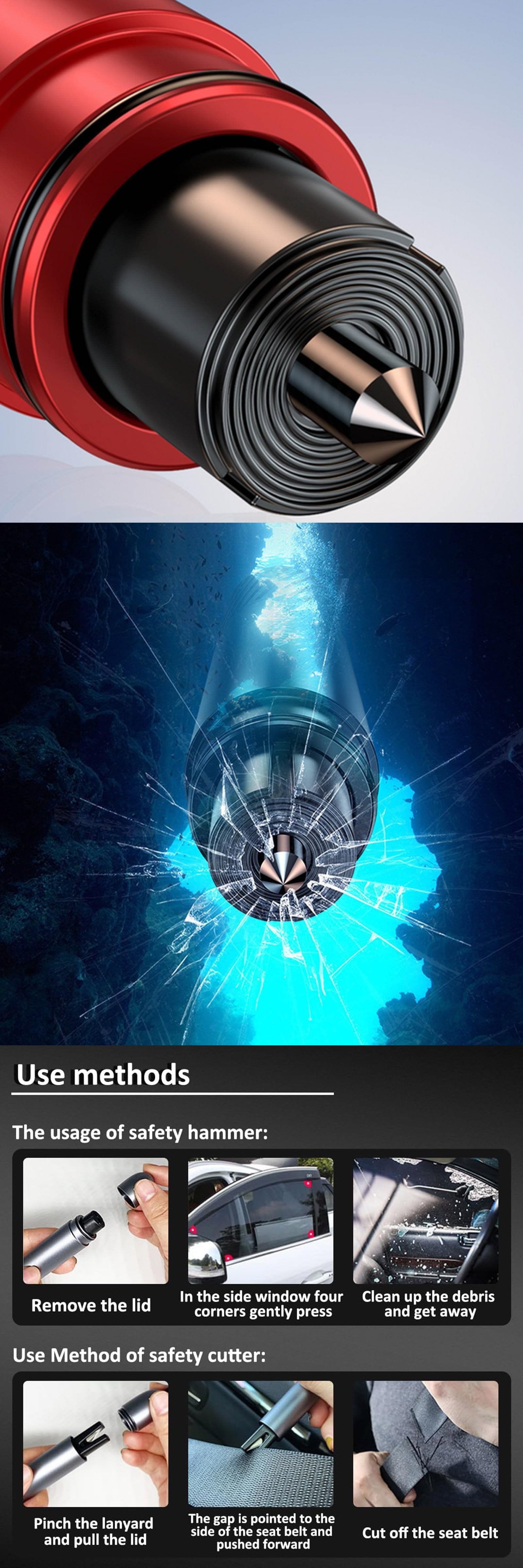 Młotek do wybijania szyb samochodowych : Nasz bezpieczny młotek samochodowy jest wykonany z niezniszczalnej głowicy ze stali wolframowej. Łatwy w użyciu: (1) Zdejmij zaślepkę. (2) Naciśnij płaską końcówkę bardzo mocno na szybę przez sekundę. Spowoduje to natychmiastowe uwolnienie sprężyny naciskowej i potężne uderzenie rozbijające szkło. Łatwe do wykonania po jednokrotnym użyciu. Nie uderzaj młotkiem w szybę. (W zestawie z kawałkiem szkła, dzięki czemu można go przetestować).