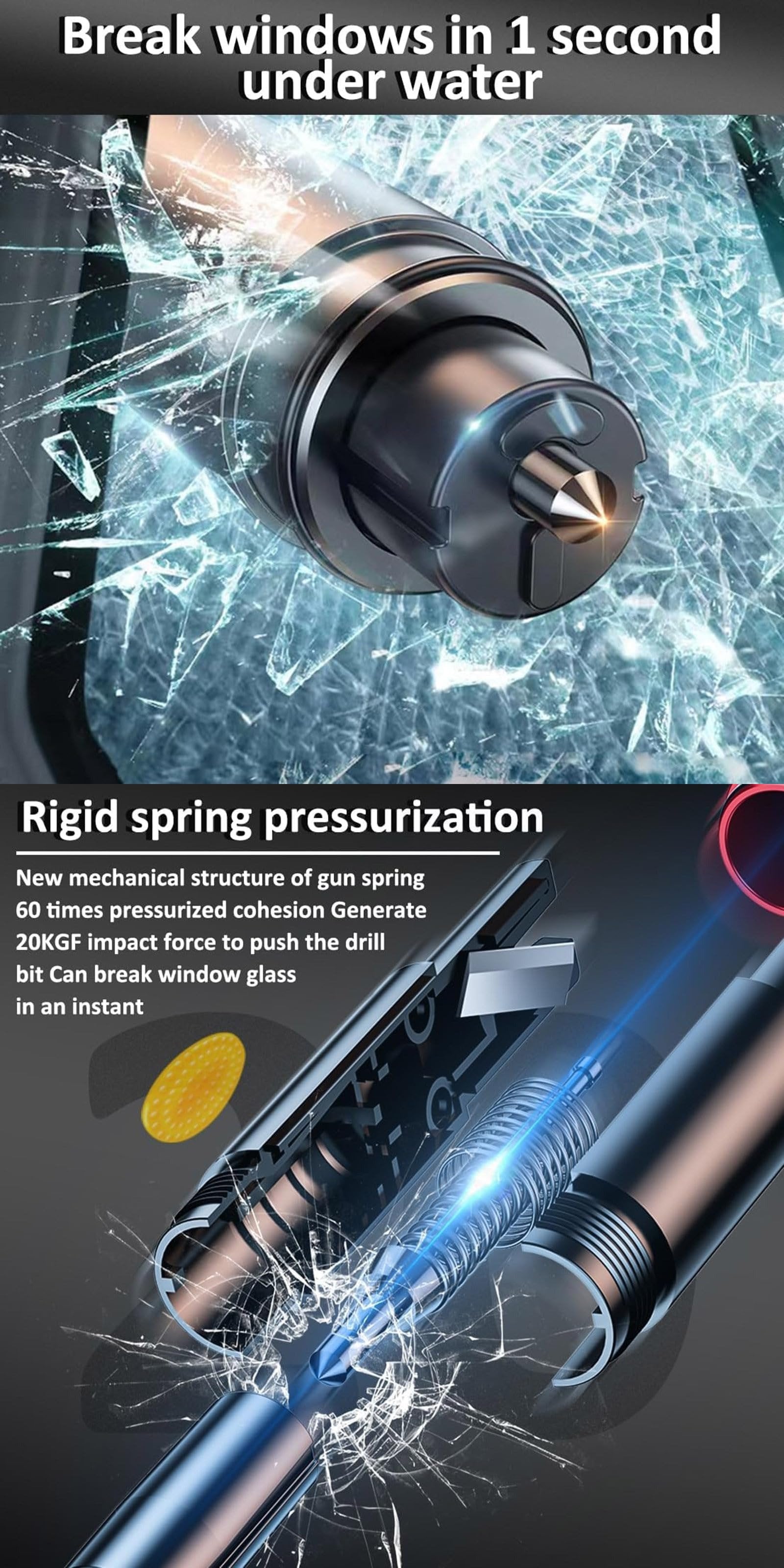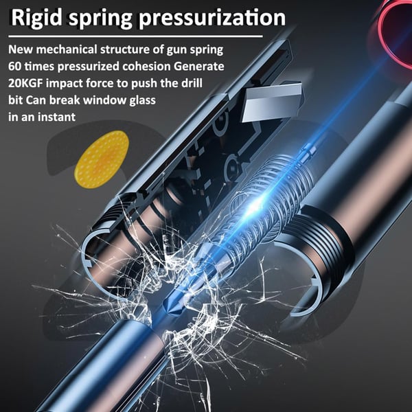 ŁAMACZ SZYB DO POJAZDÓW: Ten młot do rozbijania szyb 2 w 1 ma wbudowaną sprężynę wysokociśnieniową i wytrzymałe ostrze ze stali wolframowej o twardości 55. Wraz z siłą uderzenia 6 kg może błyskawicznie rozbić solidne szkło okienne. Uwaga: Metalowa końcówka pozostaje wewnątrz narzędzia - wysuwa się tylko podczas rozbijania szkła.